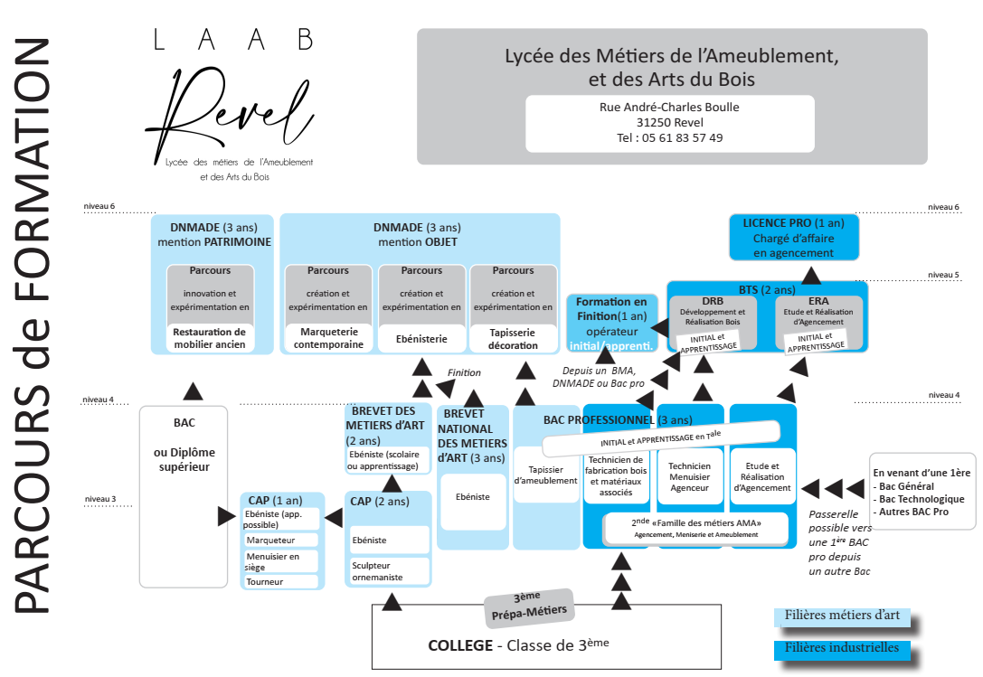 L'organigramme ci-dessous présente l'ensemble des formations initiales dispensées au sein du Lycée professionnel de l'ameublement, ainsi que les formations technologiques BTS ERA et BTS DRB puis vers une licence pro chargé d'affaire en agencement.